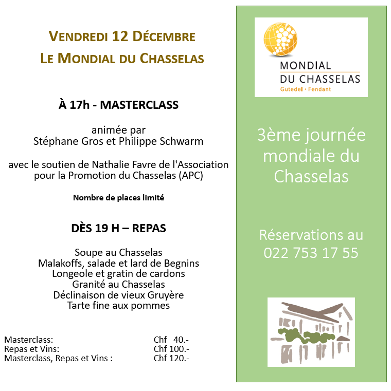 Accords mets et vins “le chasselas dans tous ses états”, présentation par Philippe MARTIN, oenologue au restaurant Le Dahu (prix pour la soirée CHF 75, sur inscription)